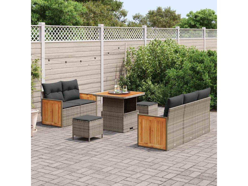 - Materiály: Tento set má kvalitní rám z odolné práškově lakované oceli, což zajišťuje dlouhou životnost. Sedáky a opěradla jsou vyrobeny z moderního poly ratanu, což zajišťuje pohodlí a eleganci. Povrch z masivního akáciového dřeva dodává zahradě přírodní šmrnc a celkově vylepšuje design.