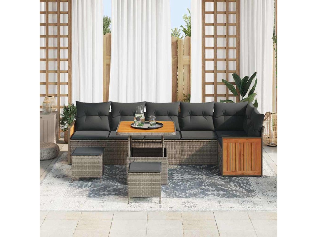- Materiály: Tento set je vyrobený z odolného poly ratanu, který vypadá skvěle a zvládne venkovní podmínky. Jeho odolnost mu zaručuje dlouhou životnost a krásně zpracovaná akáciová deska dodává na přírodním a sofistikovaném vzhledu.