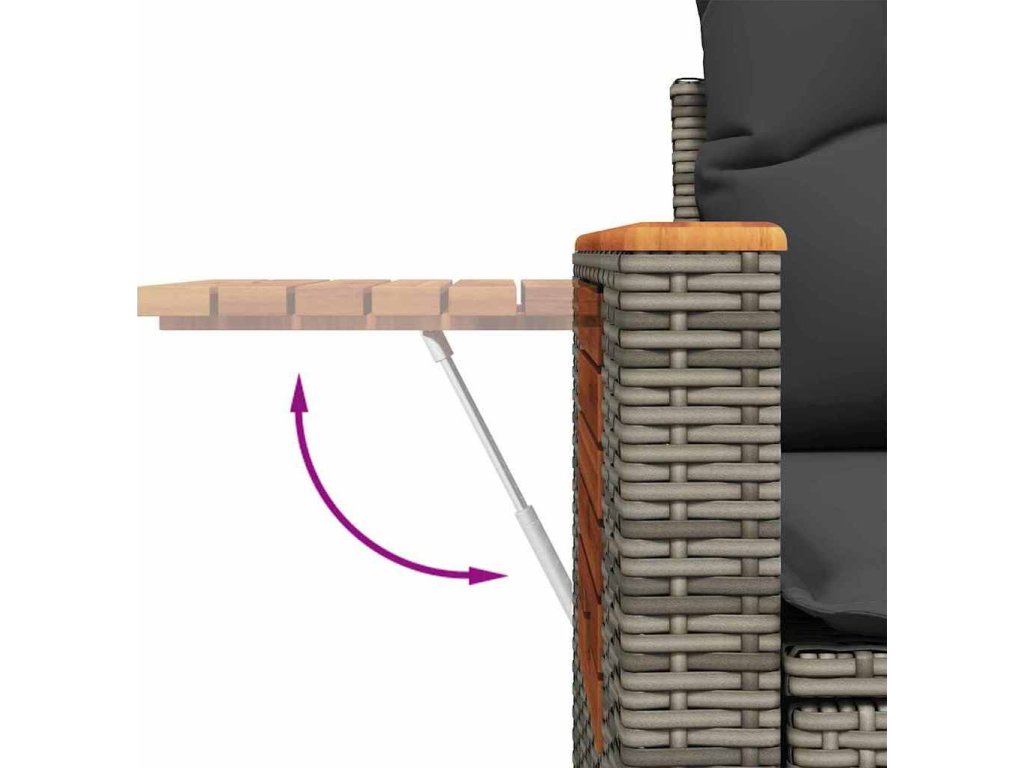 - Součásti: Set má pohodlné sezení s opěrkami z poly ratanu, takže se na něm hezky relaxuje. Každý díl má příjemné venkovní polštáře, které se snadno sundají pro praní nebo výměnu, takže stačí udržovat hygienu. Sedací plochy z hnědého akáciového dřeva tvoří ideální místo na nápoje nebo dekorace.