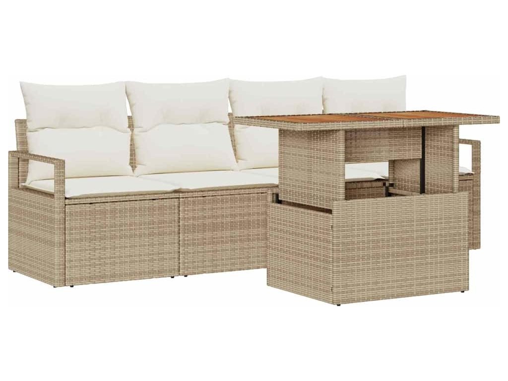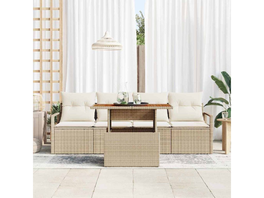 - Funkční prvky: Souprava obsahuje dvě pohovky s opěrkami a dvě středová místa se zabudovaným úložným prostorem pro vaše venkovní věci. K tomu pevný zahradní stůl z akáciového dřeva, ideální na jídlo nebo neformální setkání. Všechno je navržené tak, abyste měli uspořádaný venkovní prostor.