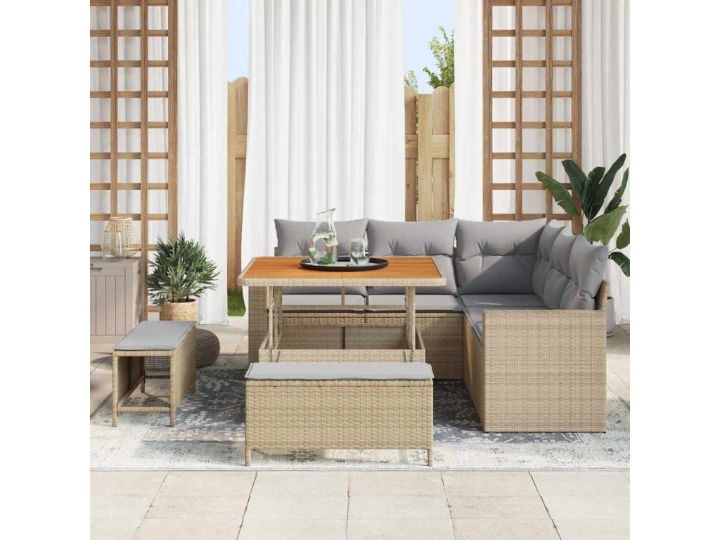 - Prémiové materiály: Sada je vyrobená z polyratanu a masivního akáciového dřeva. Vypadá elegantně a je odolná. Polyratan je skvělý proti počasí a akáciové dřevo přidává přirozenou krásu, takže to vydrží dlouho.