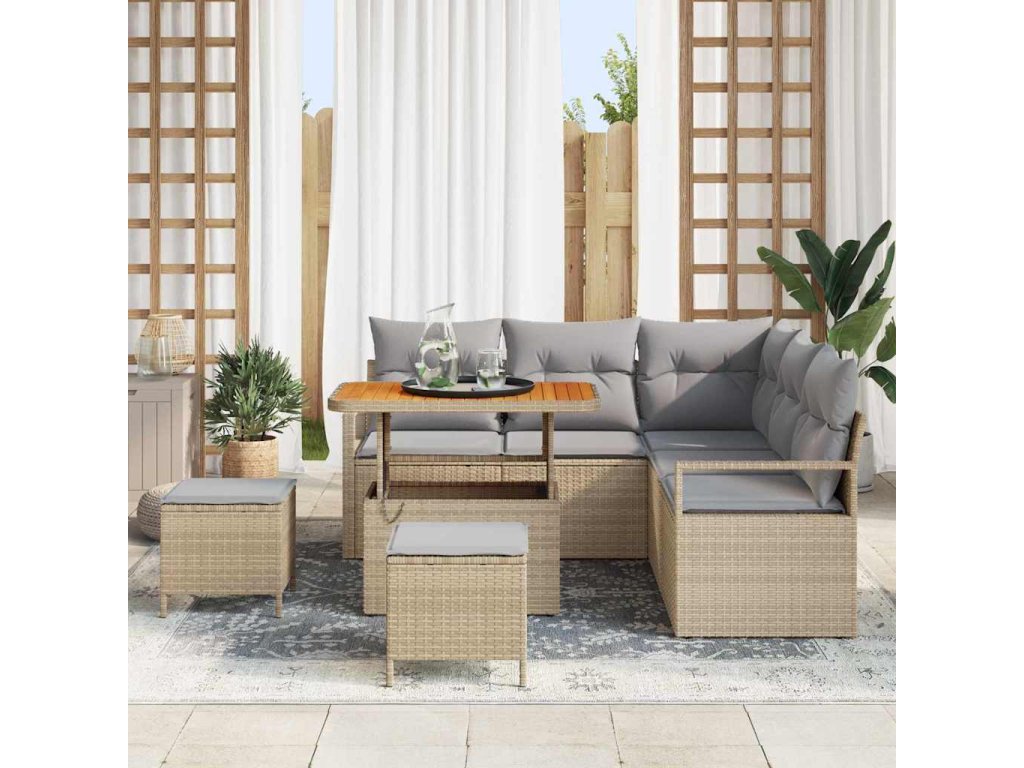 - Vysoce kvalitní materiály: Tato sedací souprava z poly ratanu nabízí stylový a odolný povrch, který vydrží venkovní počasí. Rámy z práškově lakované oceli jsou pevné a akáciové dřevo dodává celému designu elegantní nádech.
