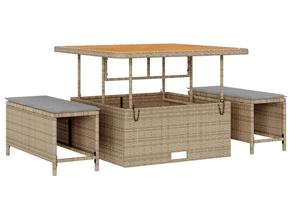 - Součásti: Sada obsahuje důmyslné prvky, jako jsou opěrky rukou z polyratanu a malé plochy z krásného akáciového dřeva. Rám z práškově lakované oceli všechno drží stabilní, a akáciové dřevo dodává příjemný, přírodní pocit. K tomu jsou polštáře odolné vůči povětrnostním vlivům, abyste se cítili co nejlépe.