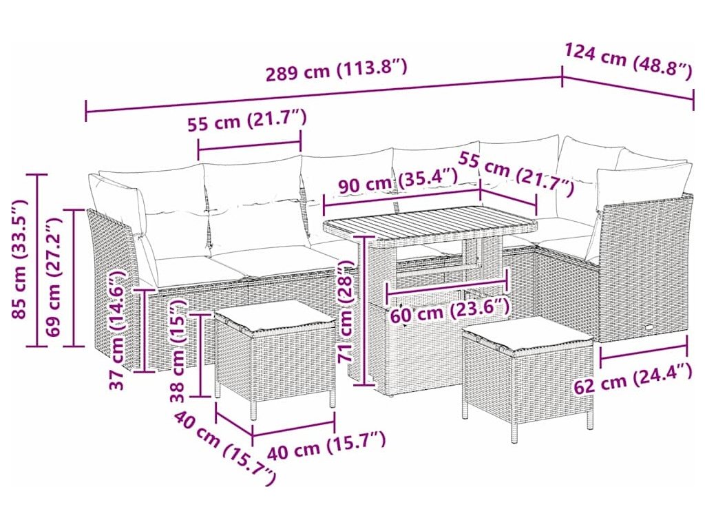 - Vlastnosti / Funkce / Design: Sedací souprava je navržena pro venkovní použití s materiály odolnými vůči UV záření, které snesou slunečné dny. Odnímatelné polštáře usnadňují údržbu a udržují se v pořádku. Ploché opěrky rukou a elegantní linie dodávají moderní vzhled.