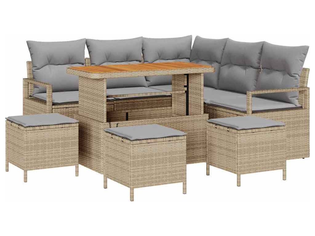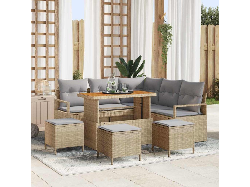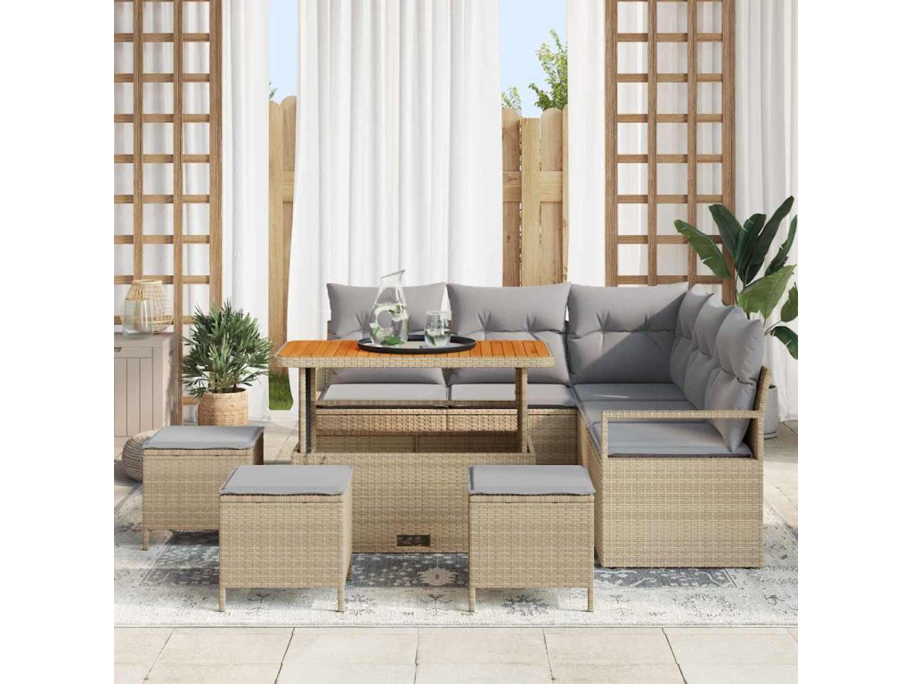 - Vysoce kvalitní materiály: Tato sedací souprava z poly ratanu nabízí stylový a odolný povrch, který vydrží venkovní počasí. Rámy z práškově lakované oceli jsou pevné a akáciové dřevo dodává celému designu elegantní nádech.