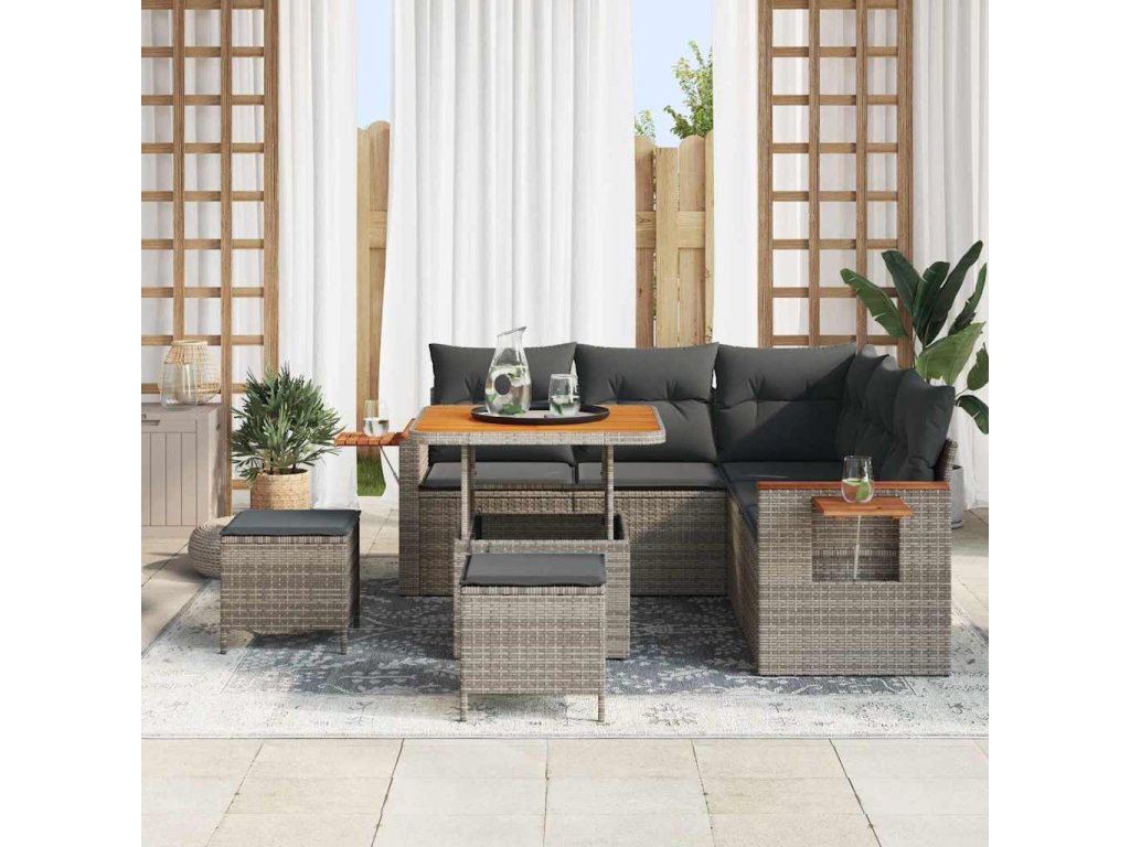 - Materiály: Odolná a elegantní konstrukce z poly ratanu a masivního akáciového dřeva. Tato kombinace vypadá skvěle a vydrží každé počasí, takže vaše souprava bude v bezpečí a stále krásná. Poly ratan dodává moderní vzhled a akácie přináší tradiční krásu, což z ní dělá ideální volbu pro venkovní použití.