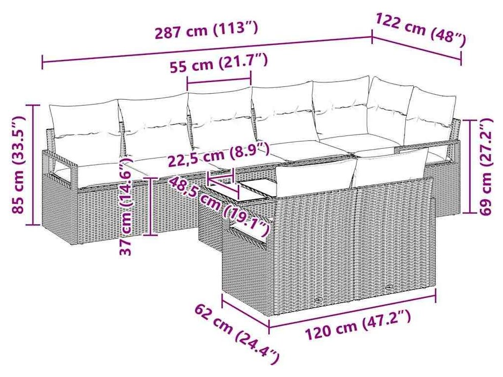 - Materiál Poly ratan: Pohovkový set je vyroben z poly ratanu, který je vizuálně atraktivní i velmi odolný. Díky tomu odolává UV záření a barva tak nevybledne.
