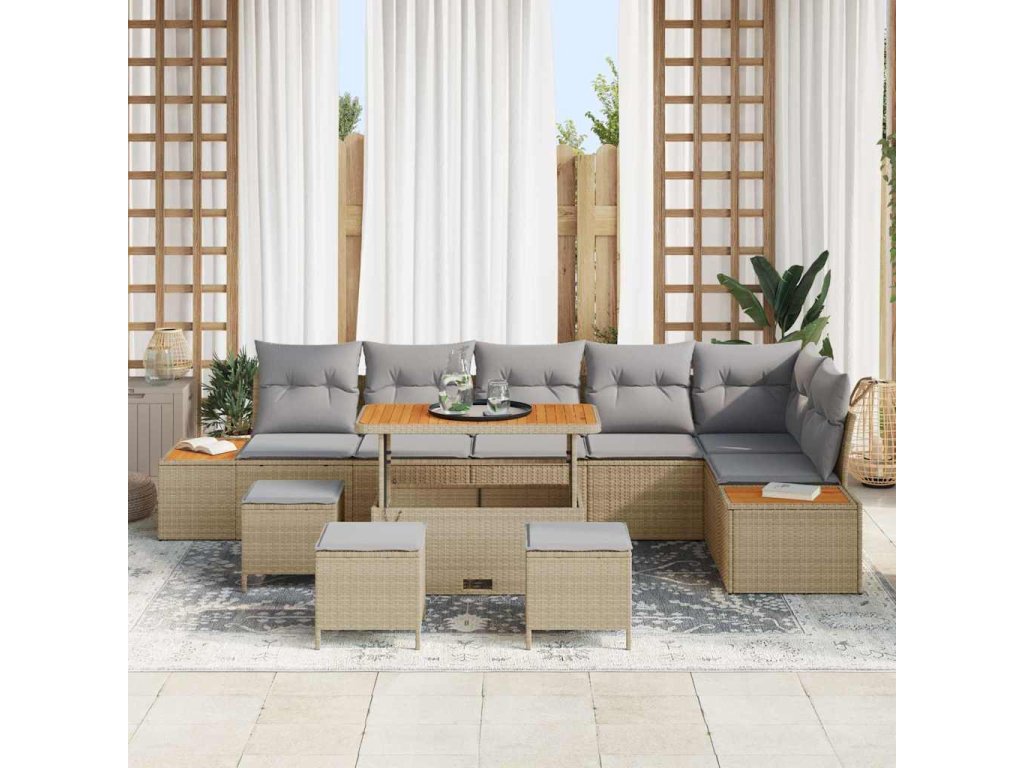- Moderní materiály: Pohovka z kvalitního poly ratanu a masivního akáciového dřeva, díky čemuž je odolná počasí a má šmrnc. Poly ratan dodává moderní design, akáciové dřevo zase příjemný vzhled.