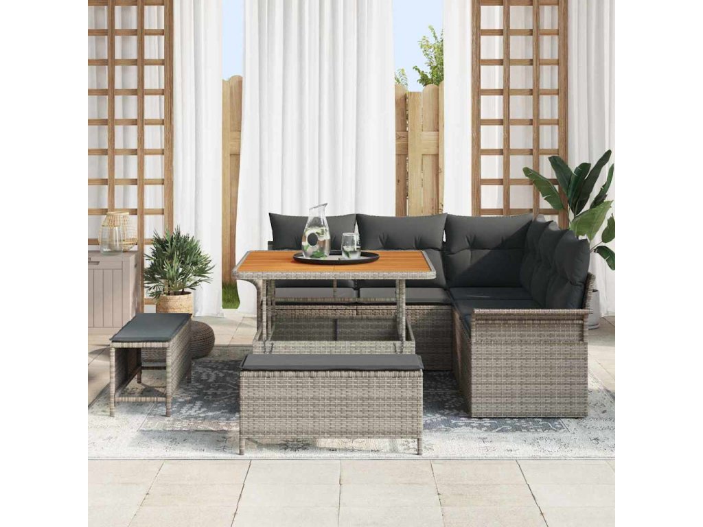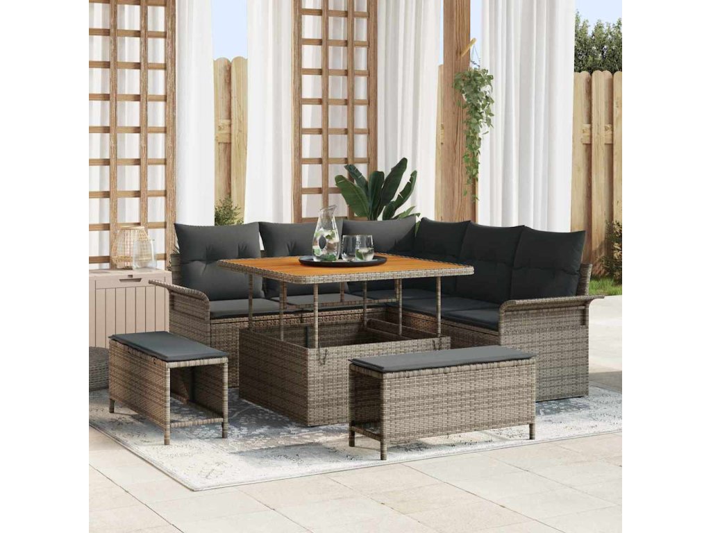 - Špičkové materiály: Sada pohovek je většinou z poly ratanu, odolného vůči počasí. Je perfektní pro venkovní použití, protože snižuje opotřebení během sezóny. Odolná a s rámem z práškově lakované oceli, což ji dělá pevnou proti různým povětrnostním podmínkám. Akáciové dřevo skvěle vypadá a zůstává bez prasklin.