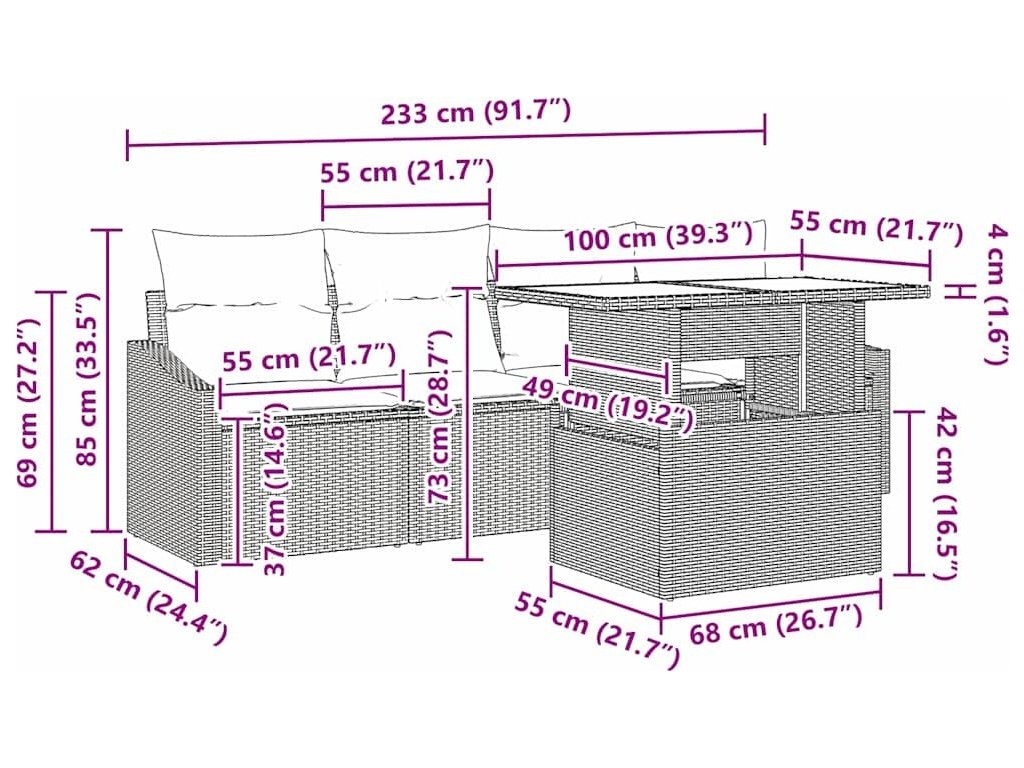 - Integrované komponenty Set má praktické výškově nastavitelné stolky, které lehce přejdou z kávového stolu na jídelní plochu, což usnadňuje různorodé akce. Pohodlné opěrky vyrobené ze shodného poly ratanu doplňují celkový styl.
