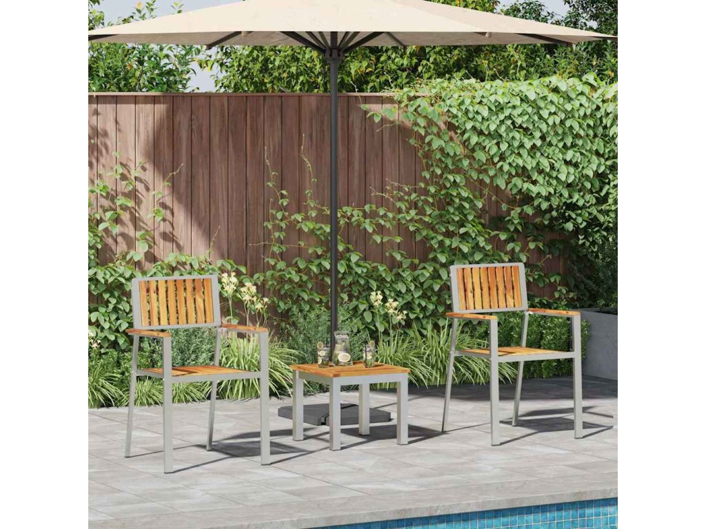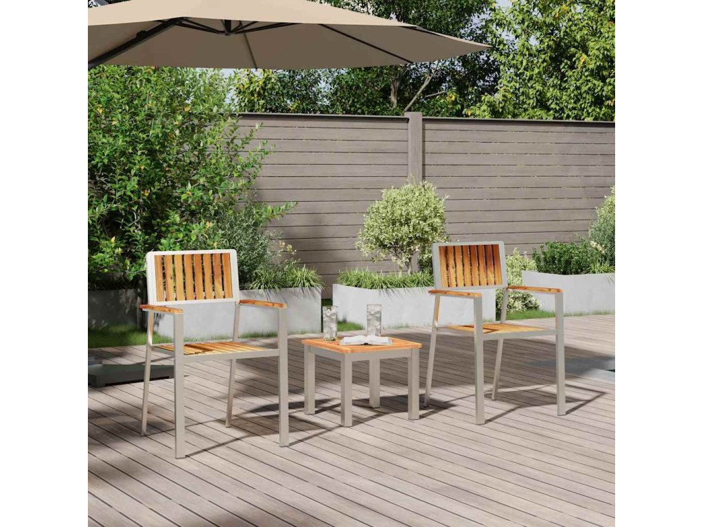 - Komponenty z nerezové oceli Nohy a rám soupravy jsou z nerezovky, takže to vydrží a vypadá skvěle. To zaručuje, že nábytek zvládne i horší počasí a hodí se ven po celý rok.