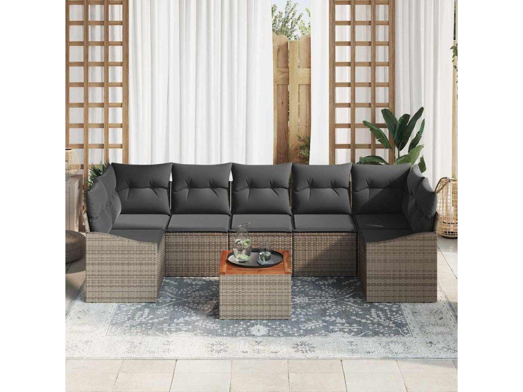 - Materiály: Sofa set je vyrobený z poly ratanu, který je skvělý kvůli své UV odolnosti a schopnosti vydržet venkovní podmínky. Prvky z akáciového dřeva dodají přírodní vzhled, zatímco práškově lakovaný ocelový rám zajišťuje stabilitu a pevnost. Tyto kvalitní materiály spojují styl a odolnost, takže si můžeš užívat set celý rok.