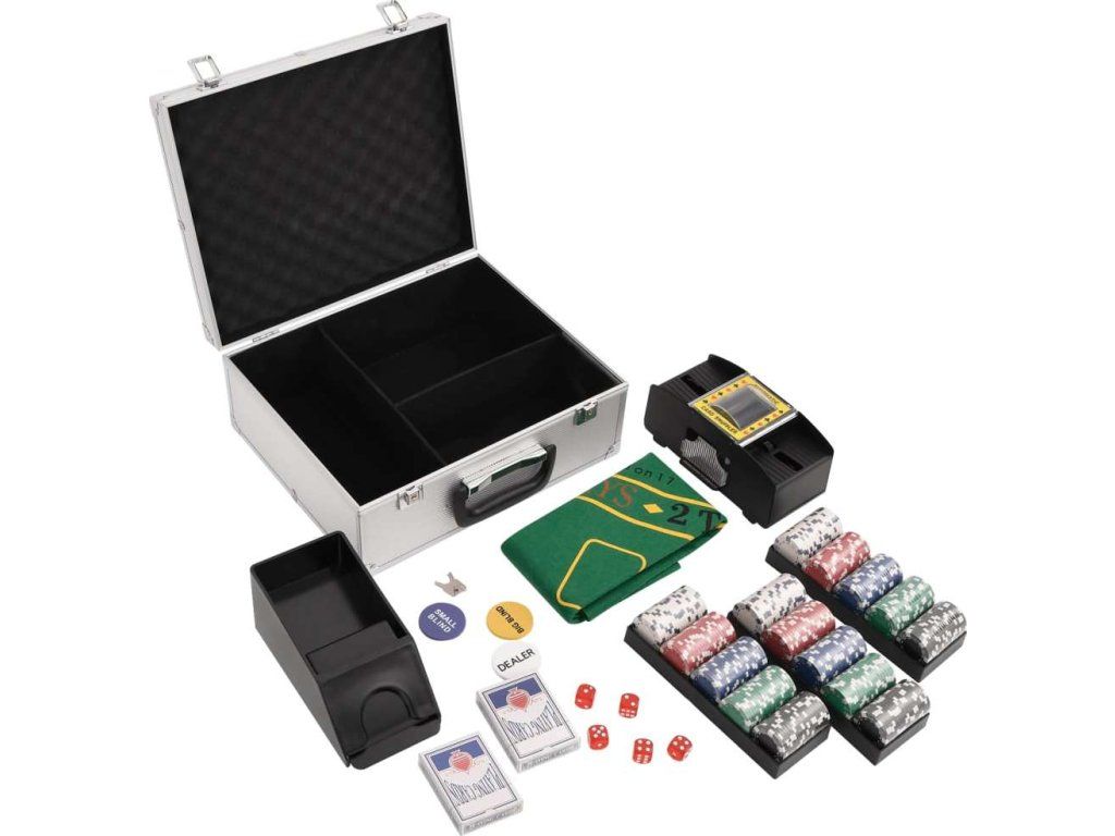 - Profesionální pokerová sada: Tato sada obsahuje 5 kostek, 1 karetní botu, 2 balíčky karet, 3 držáky na žetony, 1 automatickou míchačku karet, 1 hrací podložku, 1 žeton pro dealera, 1 žeton malý blind, 1 žeton velký blind a 300 hracích žetonů.