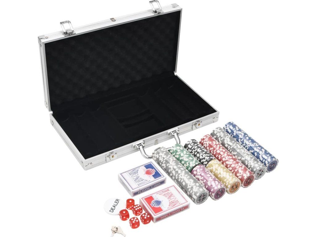 - Profesionální pokerová sada: Tato sada obsahuje 5 kostek, 2 balíčky karet, 1 žeton pro dealera a 300 laserových žetonů.