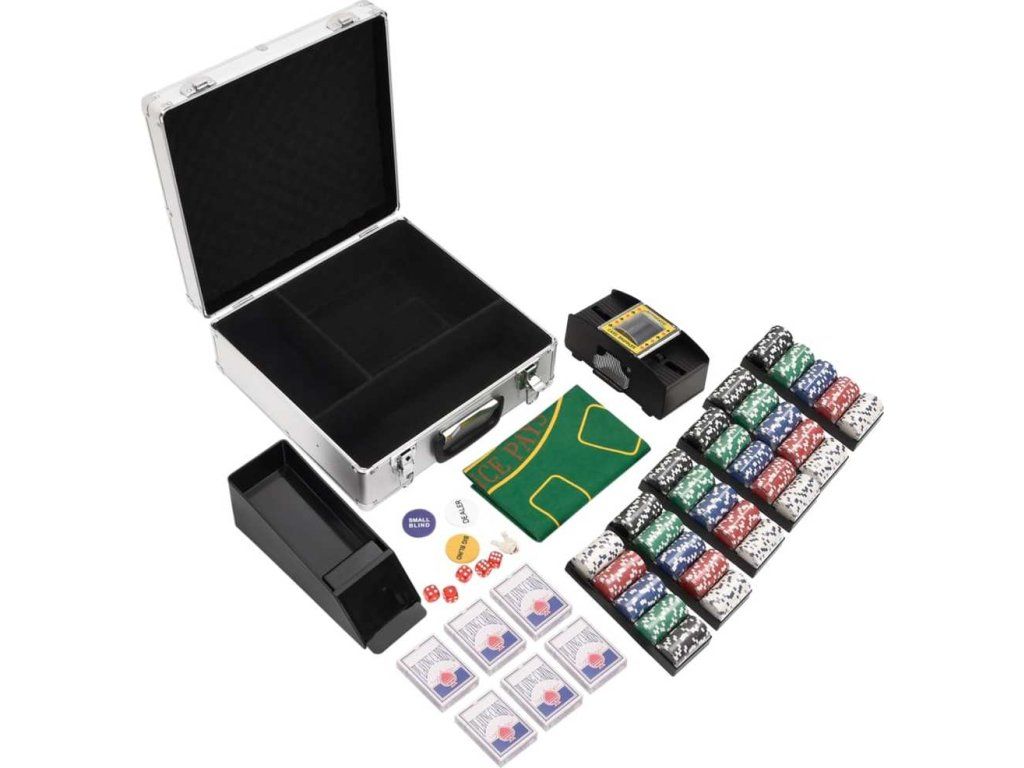 - Profesionální pokerová sada: Tato sada obsahuje 5 kostek, 1 karetní botu, 6 balíčků karet, 6 držáků na žetony, 1 automatickou míchačku karet, 1 hrací podložku, 1 žeton pro dealera, 1 žeton malý blind, 1 žeton velký blind a 600 hracích žetonů.
