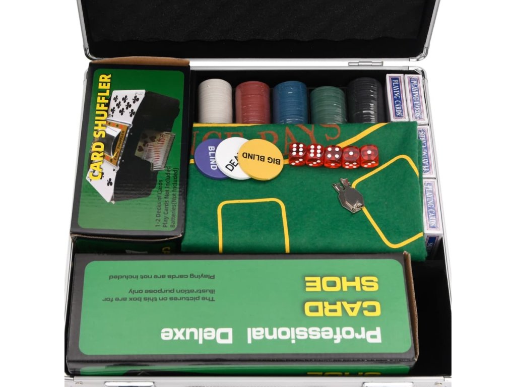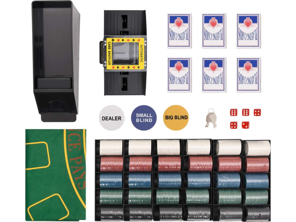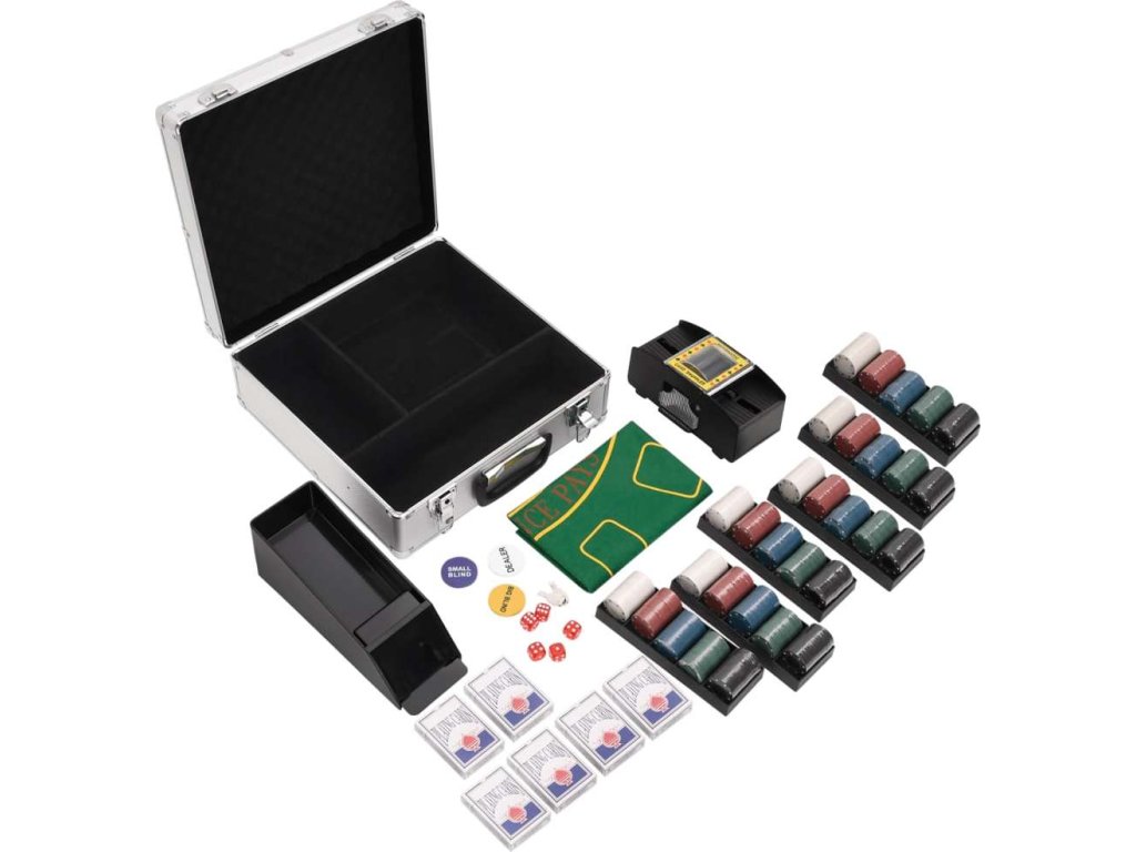 - Profesionální pokerová sada: Tato sada obsahuje 5 kostek, 1 karetní botu, 6 balíčků karet, 6 držáků na žetony, 1 automatickou míchačku karet, 1 hrací podložku, 1 žeton pro dealera, 1 žeton malý blind, 1 žeton velký blind a 600 hracích žetonů.