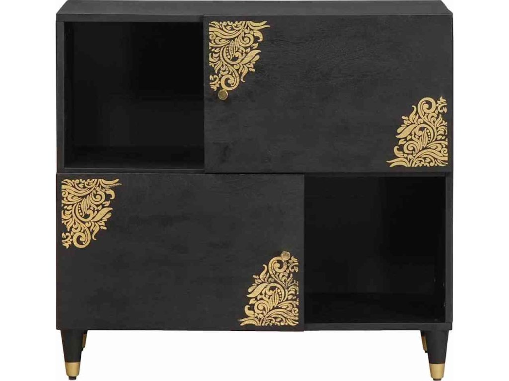 - Funkce / Design: Díky krásným zlatým motivům je skříň jak dekorativní, tak funkční. Klapkové dveře s mosaznými úchyty odhalují spoustu úložného prostoru pro organizaci různých předmětů.