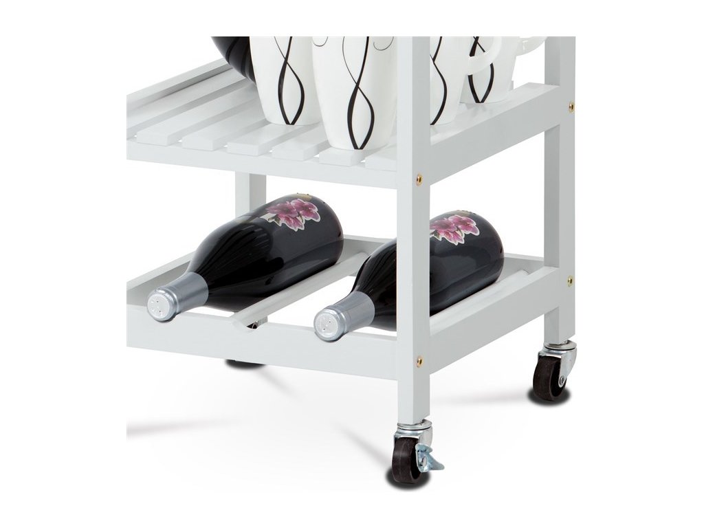 Servírovací stolek a regál DR-044 kombinuje přírodní masiv bambusové desky s bílým matným lakem na MDF nohou, což zajišťuje pevné a stabilní provedení vhodné do moderních i klasických interiérů. Vrchní deska z bambusu nabízí odolný a snadno udržovatelný povrch ideální pro přípravu a servírování jídel. Stolek je vybaven praktickou zásuvkou s kovovou úchytkou pro uložení drobných předmětů, drátěným košíkem pro snadný přístup k potravinám a dvěma policemi, které umožňují efektivní uspořádání nádobí či lahví. Pojezdová kolečka s brzdou zajišťují snadnou mobilitu a stabilitu při použití. Kompaktní rozměry a funkční design přinášejí do kuchyně nebo jídelny praktické řešení pro organizaci a servírování.