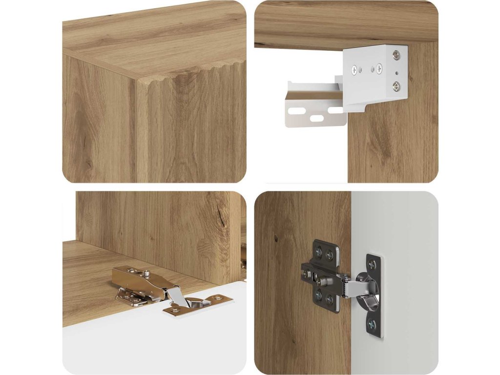 - Nástěnný design Ušetřete místo na podlaze s tímto nástěnným setem. Vysoko umístěné skříňky zajistí pořádek a prostor bez nepořádku dole. Nástěnná montáž vypadá skvěle a zabraňuje hromadění prachu pod nábytkem.