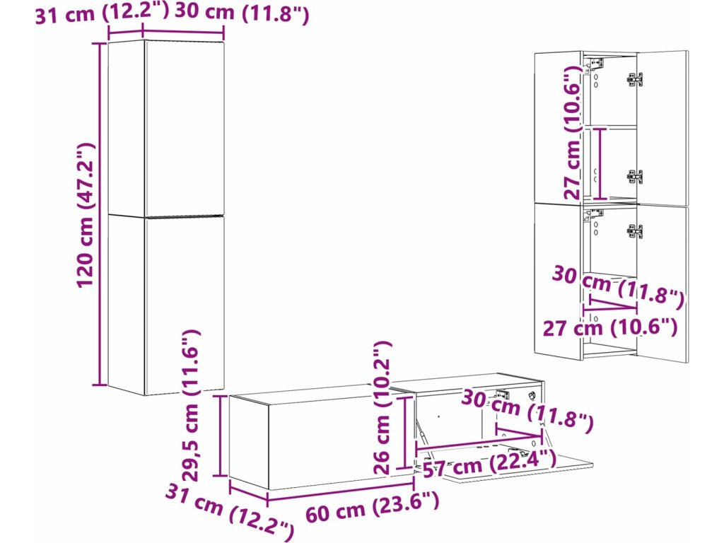 - 4 x nástěnná skříň: 31 x 30 x 60 cm (D x Š x V)
