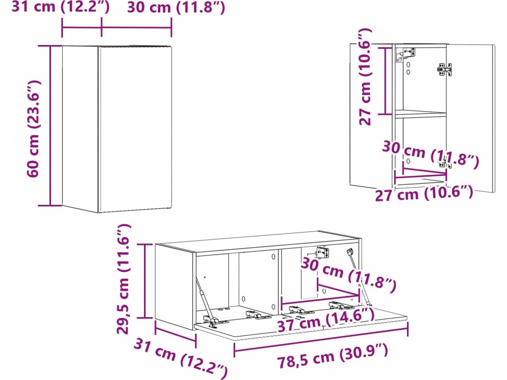 - 1 x nástěnná skříň: 30 x 31 x 60 cm (D x Š x V)