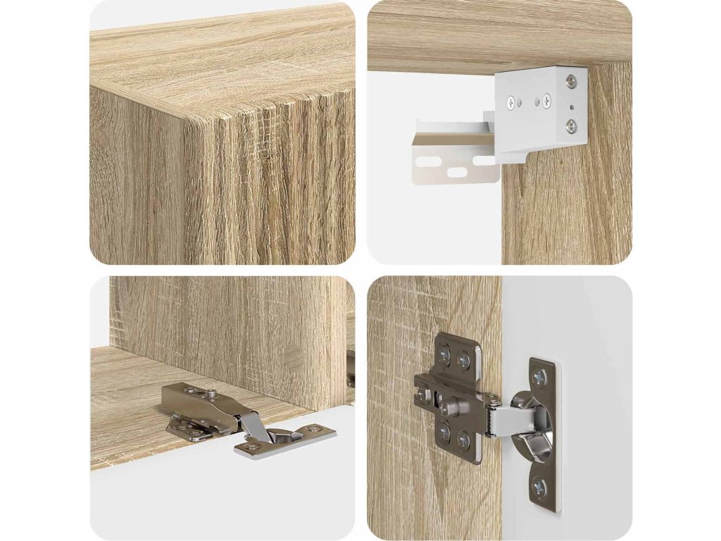 - Konstrukce z inženýrského dřeva: Set je vyroben z inženýrského dřeva, známeho svojí kvalitou a trvanlivostí. Vypadá jako masivní dřevo, ale je odolnější proti deformacím. Díky své konstrukci vydrží dlouho, což je super pro moderní interiéry.