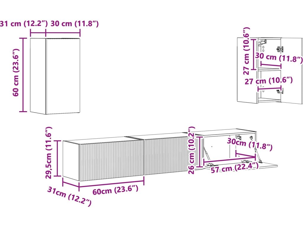 - 3 x TV skříň: 60 x 31 x 29,5 cm (D x Š x V)