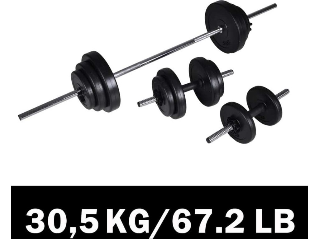 - Sada činek a kotoučů: Tato ergonomicky navržená sada obsahuje 1 obouruční činku, 2 jednoruční činky a 12 zátěžových kotoučů o celkové hmotnosti 30,5 kg včetně tyčí.