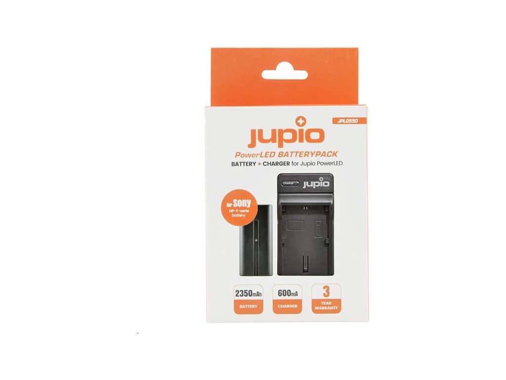 Set nabíječky a baterie Jupio NP-F550 s kapacitou 2350 mAh, která je určena pro kompatibilní digitální fotoaparáty Sony a světla Jupio PowerLED.