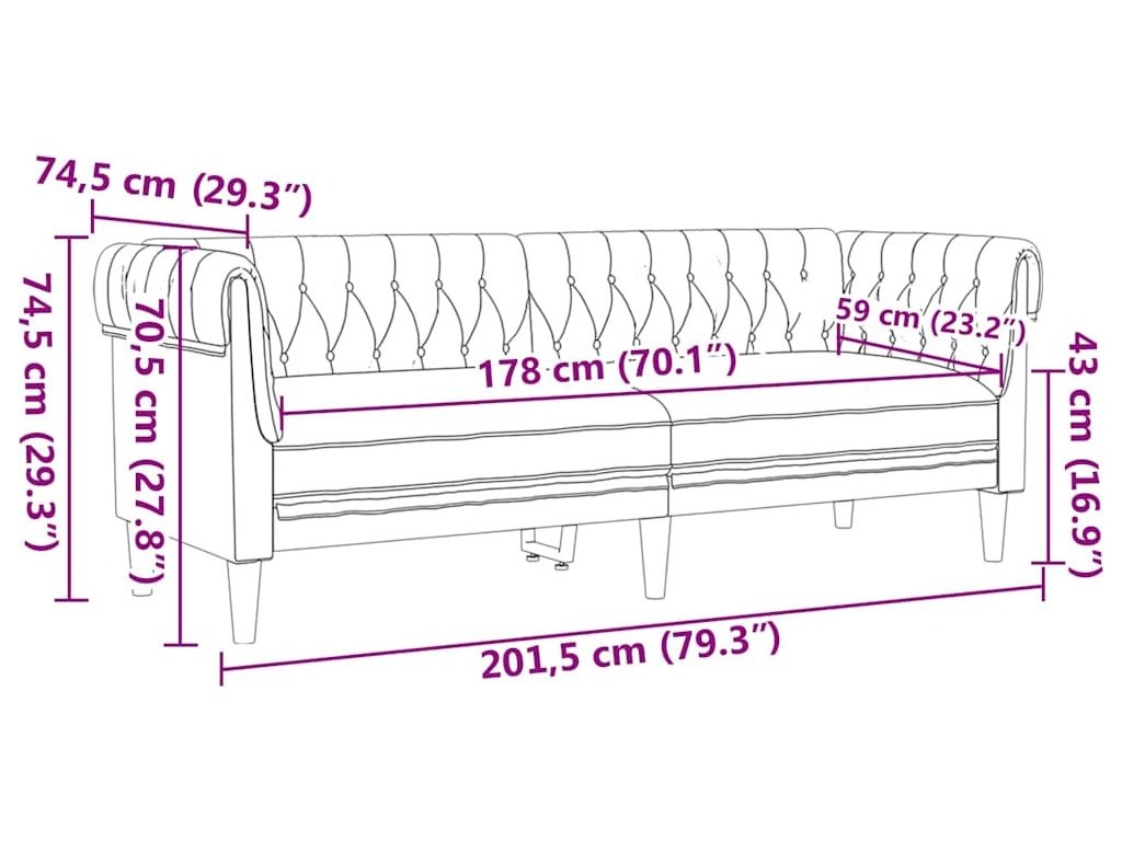 - 1 x třímístný gauč: 201.5 x 74.5 x 74.5 cm (D x Š x V)
