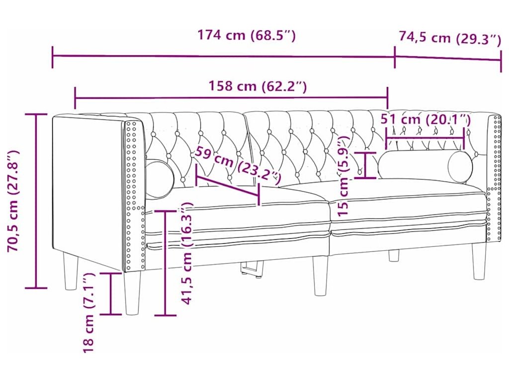 | 1 x 2-místná pohovka: | 174 x 74.5 x 70.5 cm (D x Š x V) |