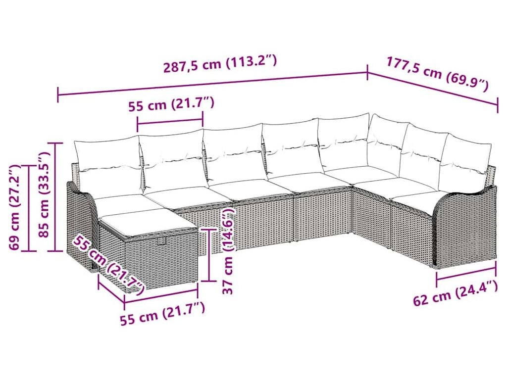 - Celkové rozměry: 287,5 x 177,5 x 85 cm (D x Š x V)