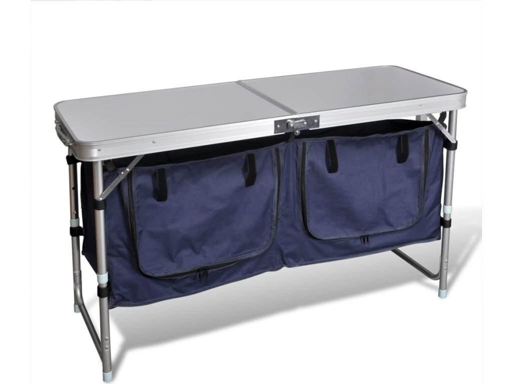Tento skládací kempingový příborník má širokou pracovní plochu a 2 úložné prostory. Perfektně se hodí pro venkovní použití.