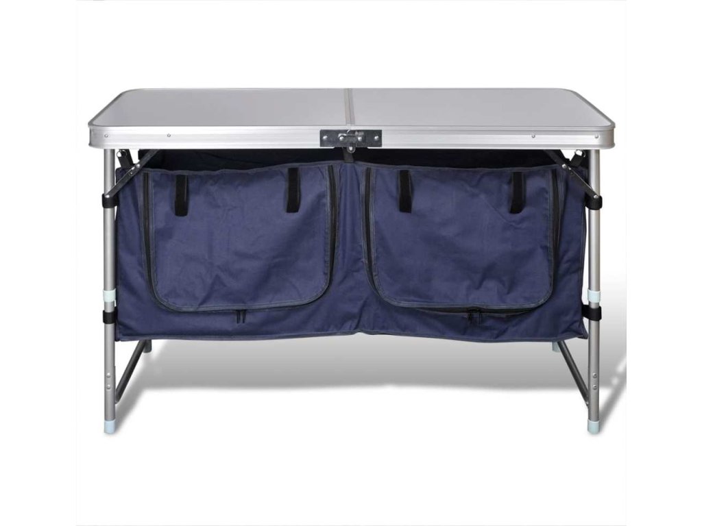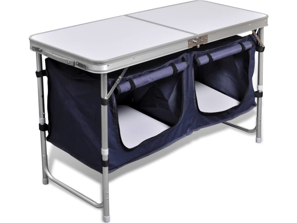 Tento skládací kempingový příborník má širokou pracovní plochu a 2 úložné prostory. Perfektně se hodí pro venkovní použití.