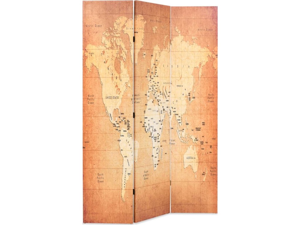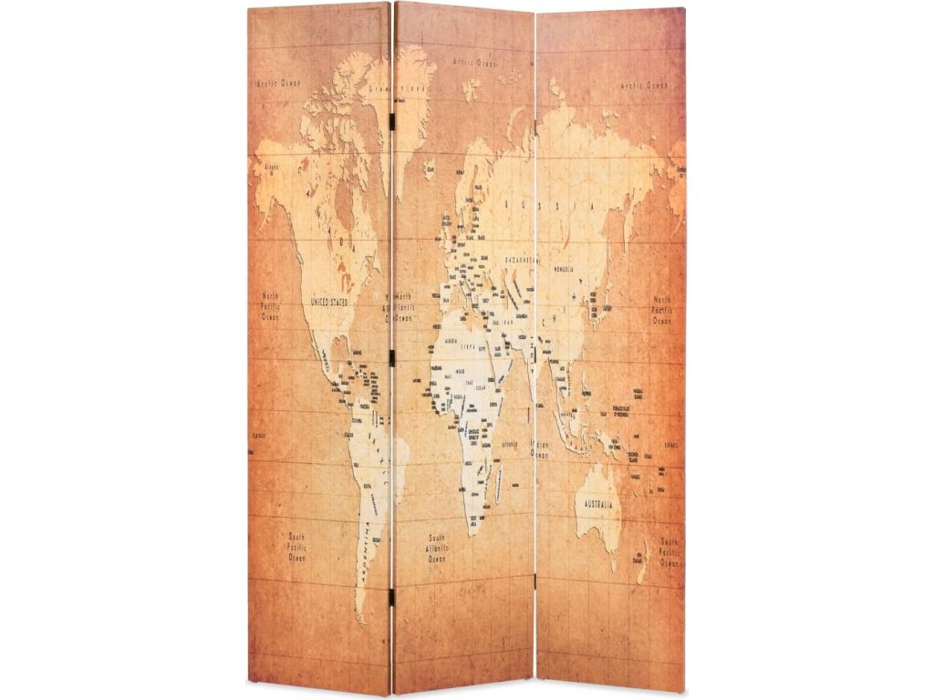 Paraván má masivní dřevěný rám a je pokrytý odolným plátnem, na kterém je natištěna mapa světa v zemitých tónech. Vašemu interiéru dodá dotek moderního šarmu. Paraván lze také snadno sklopit pro úsporné skladování, když se nepoužívá.