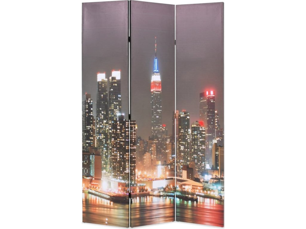 Tato dělící stěna má masivní dřevěný rám a je potažená odolným plátnem, na kterém je velkolepá fotografie vyobrazující panoramatický pohled na noční New York a nádhernou Empire State Building a vašemu interiéru dodá nádech moderního stylu. Tato dělící stěna může být pro úsporu místa také jednoduše složena, když ji právě nepoužíváte.