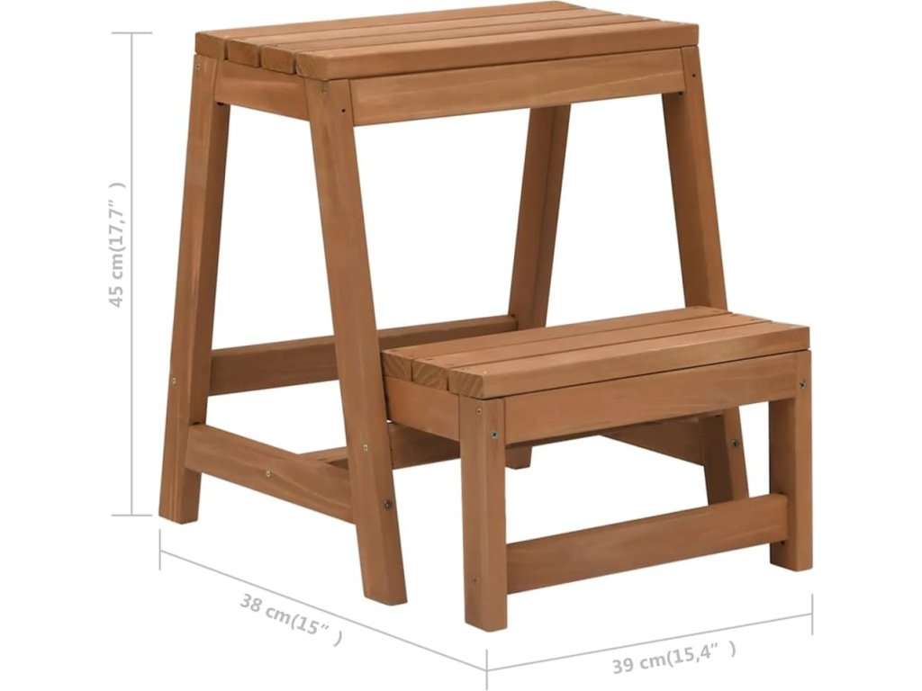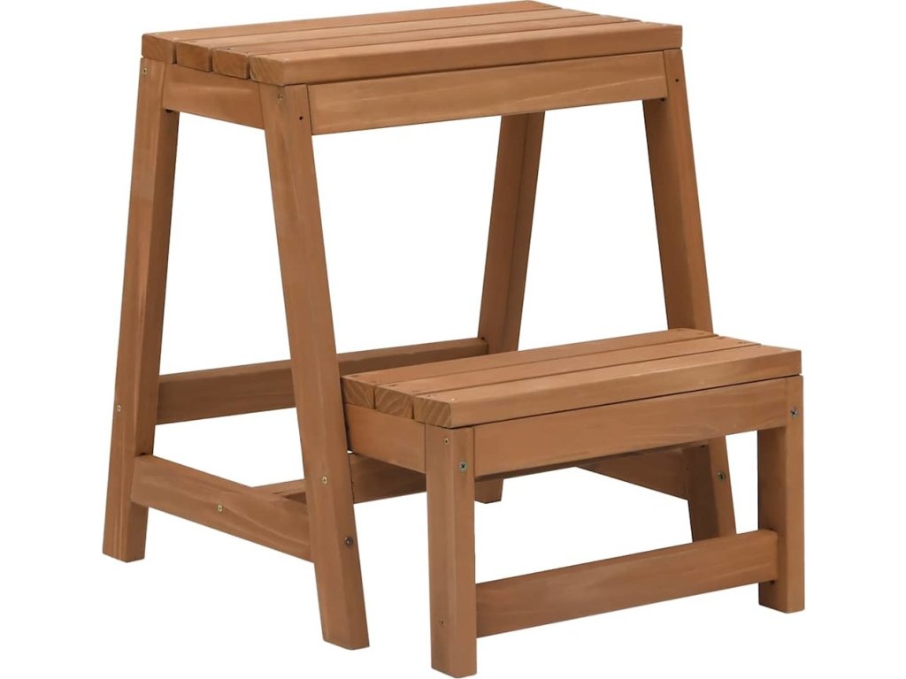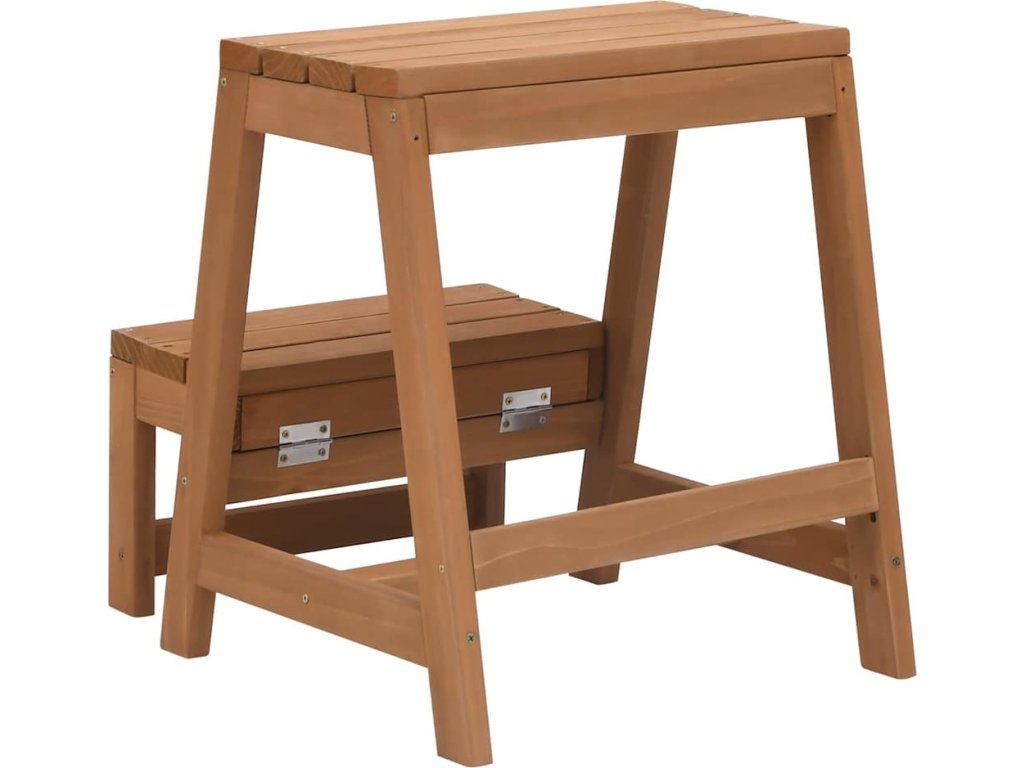 Skládací stolička je vyrobena z masivní jedle, proto je stabilní a odolná. Se skrytým složitelným schůdkem může sloužit různým účelům jako sedák pro spontánní návštěvy, schůdky pro dosažení vysokých poliček a skříněk nebo jako malý úložný nábytek v obývacím pokoji nebo ložnici. Dřevěná složitelná stolička se navíc snadno skladuje, když není používána.