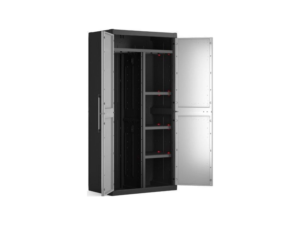 Skříň obsahuje celkem 4 přídavné police - každá s výraznou nosností až 15 kg, které přijdou vhod pro výrazně těžší předměty všeho druhu. Lze ji tedy využít pro skladování dílenského nářadí či zahradnických potřeb, například pro uložení náčiní s dlouhou násadou, které by se jinam nevešlo. Díky svému provedení v neutrální šedé barvě zapadne do každého prostoru bez ohledu na jeho konceptuální styl.