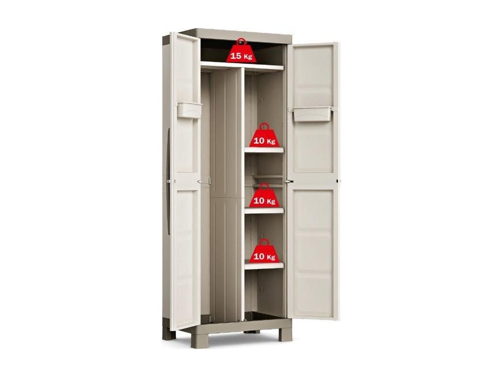 Skříň obsahuje celkem 3 přídavné police - každá s výraznou nosností až 10 kg, které přijdou vhod pro výrazně těžší předměty všeho druhu. Lze ji tedy využít pro skladování dílenského nářadí či zahradnických potřeb, kdy přijde vhod pro uložení náčiní s dlouhou násadou, které by se jinam nevešlo. Díky svému provedení v univerzální béžové barvě zapadne do každého prostoru bez ohledu na jeho konceptuální styl.