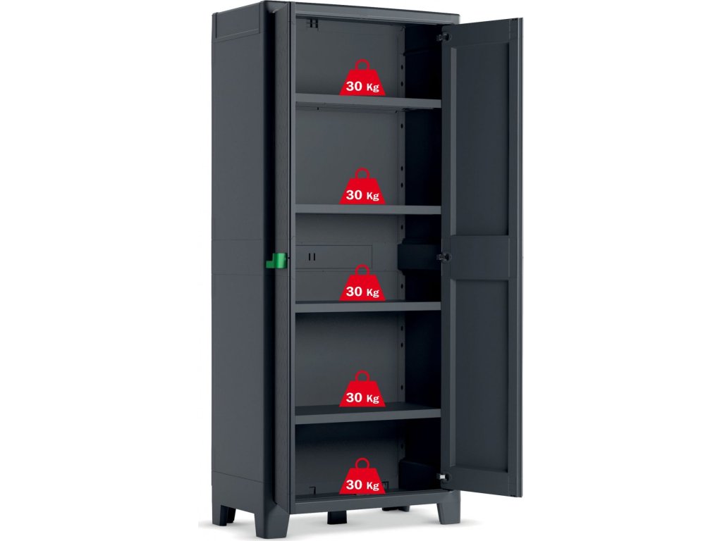 Skříň obsahuje celkem 4 přídavné police - každá s nosností až 30 kg, které přijdou vhod pro výrazně těžší předměty všeho druhu. Lze ji tedy využít pro skladování dílenského nářadí či zahradnických potřeb, kdy přijde vhod pro uložení náčiní s dlouhou násadou, které by se jinam nevešlo.