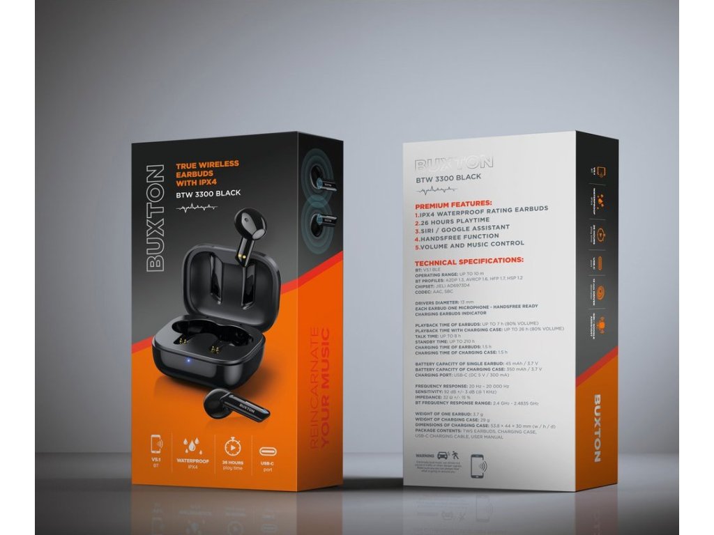 Buxton BTW 3300 patří mezi zcela bezdrátová sluchátka. Díky tomu vás neomezují v pohybu a vy můžete poslouchat hudbu i při sportu nebo na procházce se psem. Spárujte je se svým mobilem či notebookem a zpříjemněte si cvičení, úklid v domácnosti nebo se inspirujte muzikou při malování. Žádné kabely vám už nepřekáží. Sluchátka fungují až do vzdálenosti 10 metrů od spárovaného zařízení. Mají krytí IPX4 a díky tomu odolají stříkající vodě.