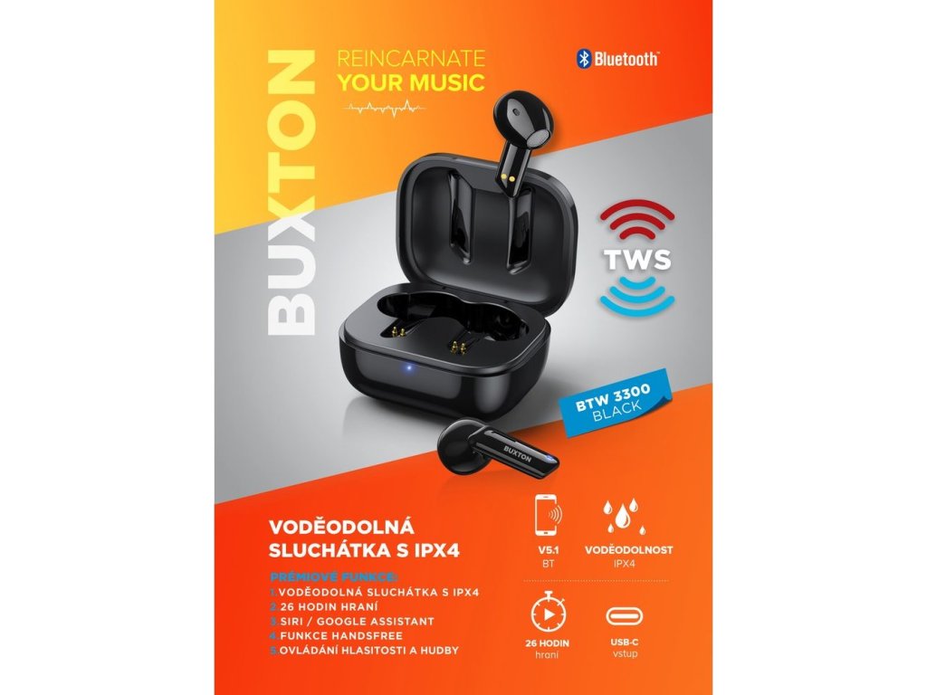 - 1x sluchátka Buxton BTW 3300 BLACK TWS