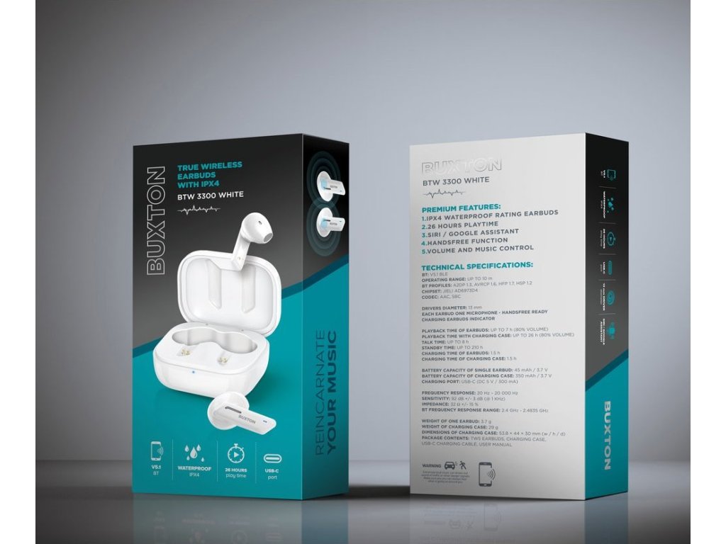 Buxton BTW 3300 patří mezi zcela bezdrátová sluchátka. Díky tomu vás neomezují v pohybu a vy můžete poslouchat hudbu i při sportu nebo na procházce se psem. Spárujte je se svým mobilem či notebookem a zpříjemněte si cvičení, úklid v domácnosti nebo se inspirujte muzikou při malování. Žádné kabely vám už nepřekáží. Sluchátka fungují až do vzdálenosti 10 metrů od spárovaného zařízení. Mají krytí IPX4 a díky tomu odolají stříkající vodě.