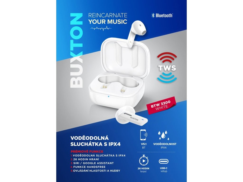 - 1x sluchátka Buxton BTW 3300 WHITE TWS