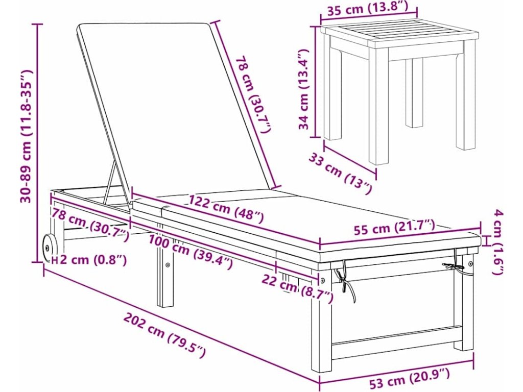 | 2 x sluneční lehátko: | 202 x 53 x 89 cm (D x Š x V) |