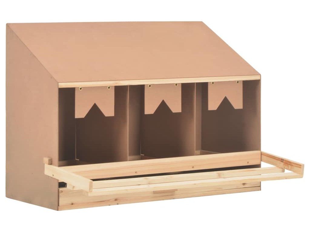 Tři prostorné boxy jsou určené pro 3 velké slepice, které se zde mohou pohodlně uvelebit a snášet vejce. Vejce šetrně padají skrz otvory v podlaze do spodní zásuvky, což usnadňuje jejich sbírání. Vysouvací dno umožňuje jednoduché čištění. Hřady lze složit, abyste zabránili nočnímu hnízdění. Šikmá střecha slepicím znesnadňuje přizvednout se ve snáškovém hnízdě a kontaminovat vejce. V našem obchodě najdete rovněž snášková hnízda s plochou střechou.