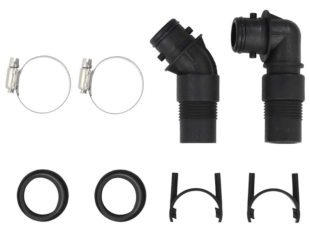 Balení obsahuje 1 ohřev bazénu, 1 hadici, 2 konektory, 2 svorky a 2 gumové kroužky.