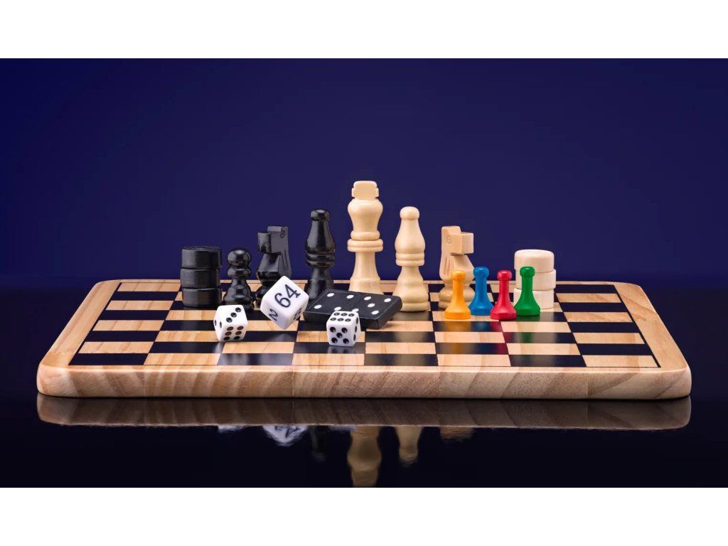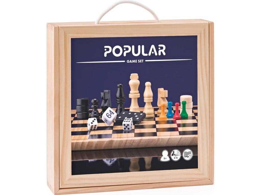 Zabavte se během deštivého a pochmurného odpoledne. Soubor her Popular vám pomůže zkrátit dlouhou chvíli. Zahrajte si s rodinou nebo s přáteli šachy, dámu, vrhcáby, mlýn nebo třeba Člověče, nezlob se. Hry obdržíte v praktickém dřevěném boxu. Můžete si je s sebou vzít na dovolenou nebo třeba na chatu.