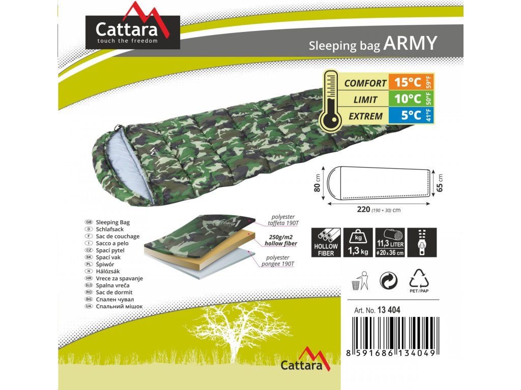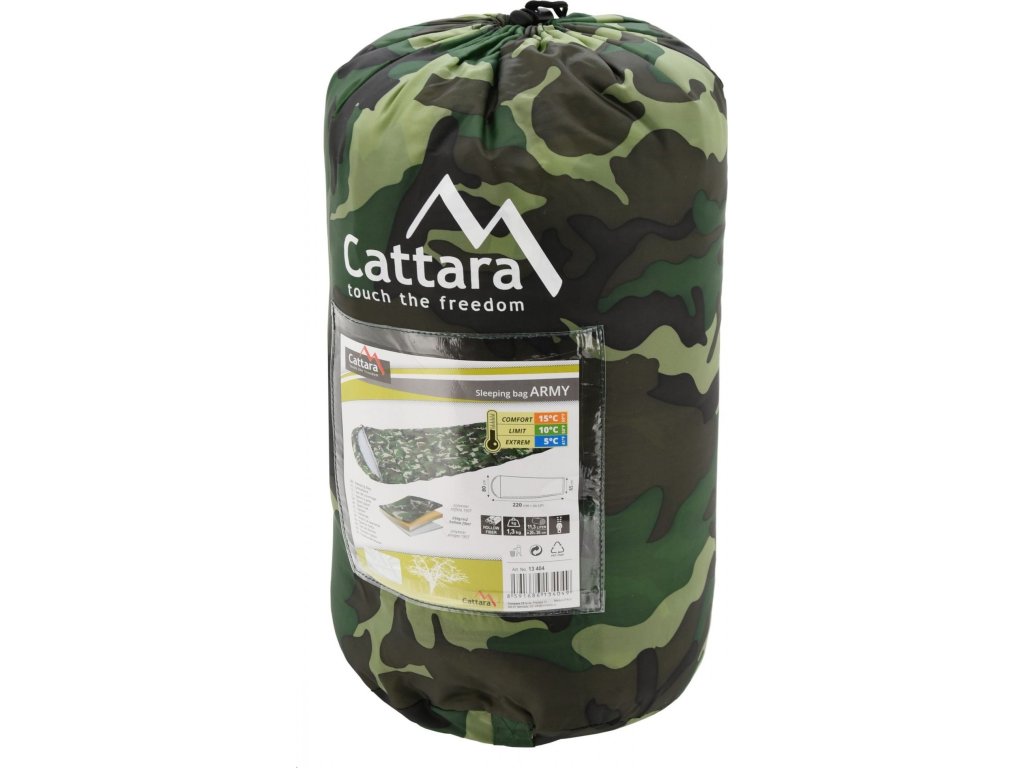Cattara ARMY 5°C představuje dekový spací pytel s univerzálním využitím a vysokým komfortem díky svým rozměrům 220 x 80 / 65 cm. Vyniká také svými malými rozměry v balení 20 x 36 cm, díky čemuž je velmi snadno přenosný. Hodí se tak pro stanování, vodácké výpravy, výlety do přírody nebo treking a skvěle náhradí i přikrývku v karavanech, kempech či na chalupě.
