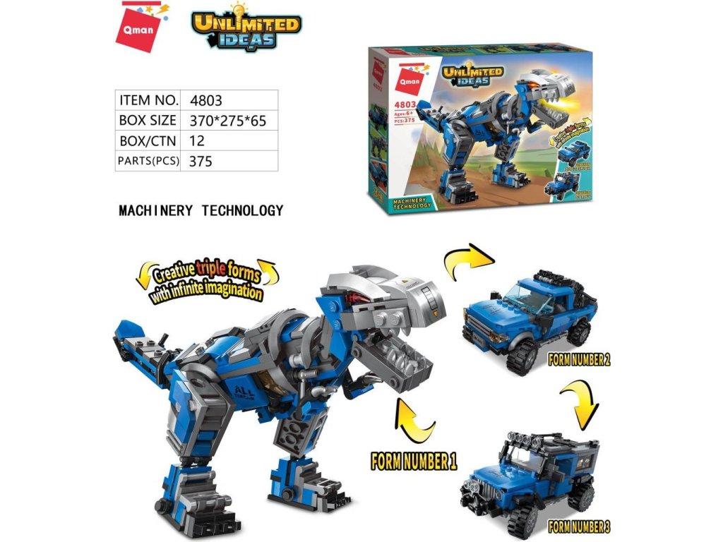 Qman Neomezené nápady 4803 Mechanická technologie 3v1 – síla spojení vědy a technologie, to je mechanický tyranosaurus. Z této stavebnice můžete kromě T-Rexe postavit 2 rozdílná autíčka. Vyrobeno z netoxického ABS plastu a v balení naleznete 375 dílků. Stavebnice je komatibilní s Lego, Sluban, Cobi apod.